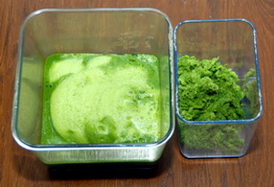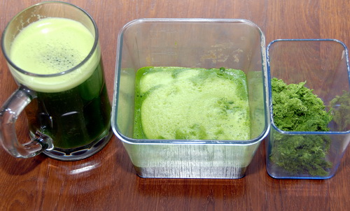 Vlevo v půllitru je zelený nápoj z mixéru, vpravo zelený extrakt z odšťavňovače.